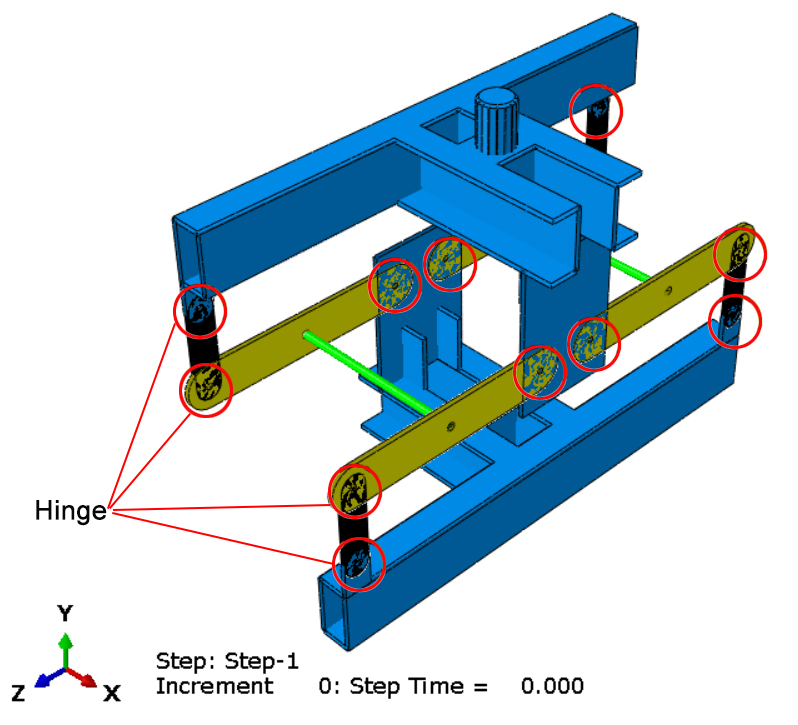 In this example, the links, levers, upper part and lower part have all been connected together by Hinges